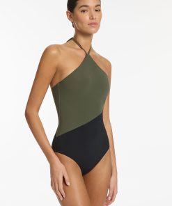 Jets Women’s One Piece Swim Versa High Neck Halter One Piece – Olive/black